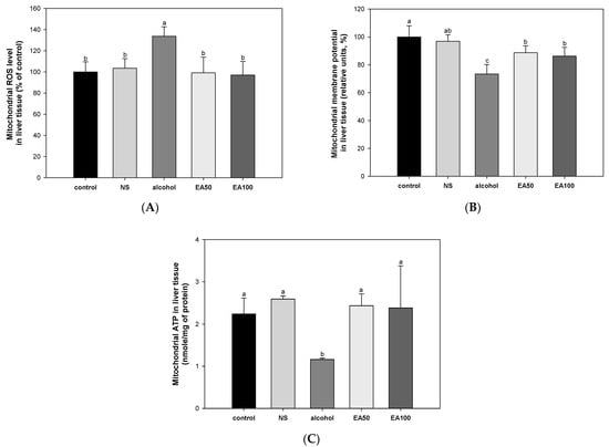 Effect of the mixture of aqueous and 60% ethanol (2:8, w/w) extracts of Allium ochotense (EA) on mitochondrial activity. (A) The mitochondrial reactive oxygen species (ROS), (B) mitochondrial membrane potential (MMP) levels, and (C) mitochondrial ATP levels. NS group, the mixture of aqueous and 60% ethanol extracts of Allium ochotense (100 mg/kg of B.W.) + drinking water; EA50 group, the mixture of aqueous and 60% ethanol extracts of Allium ochotense (50 mg/kg of B.W.) + alcohol; EA100 group, the mixture of aqueous and 60% ethanol extracts of Allium ochotense (100 mg/kg of B.W.) + alcohol. The results are shown as mean ± SD (mitochondrial analysis, n = 5). Data were statistically considered at p < 0.05, and different lowercase letters indicate statistical differences.