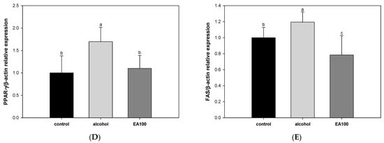 The results of an experiment to investigate the improvement mechanism against lipid metabolism imbalance of EA on alcoholic fatty liver disease (AFLD) are shown in Figure 6. The expression level of p-AMPK was shown to be significantly decreased in the alcohol group (0.64) compared to the control group. On the other hand, EA100 (1.08) significantly increased compared to the alcohol group (Figure 6B). In addition, the expression levels of SREBP-1, peroxisome proliferator-activated receptor-gamma (PPAR-γ), and fatty acid synthase (FAS) in the alcohol group (2.41, 1.70, and 1.19, respectively) were significantly increased compared to the control group. However, EA100 (1.52, 1.10, and 0.78, respectively) significantly improved alcohol-induced lipid metabolism imbalance compared to the alcohol group (Figure 6C–E).