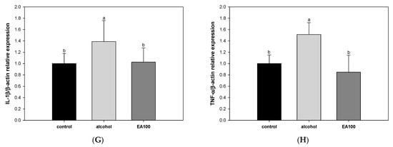 The results of investigating the improvement mechanism of alcoholic hepatitis of EA on AFLD are shown in Figure 7. The expression levels of TLR-4 and myeloid differentiation primary response 88 (MyD88) were significantly increased in the alcohol group (1.61 and 1.51, respectively) compared to the control group. On the other hand, EA100 (1.21 and 1.01, respectively) was significantly decreased compared to the alcohol group (Figure 7B,C). In addition, expression levels of a phospho-nuclear factor of kappa light polypeptide gene enhancer in B-cells inhibitor-alpha (p-IκB-α) and p-NF-κB, were significantly increased in the alcohol group (1.62 and 1.67, respectively) compared to the control group and significantly decreased in EA100 (1.06 and 1.38, respectively) (Figure 7D,E). Similarly, the expression levels of caspase 1, interleukin-1 beta (IL-1β), and TNF-α were also significantly increased in the alcohol group (1.54, 1.39, and 1.51, respectively) compared to the control group. In contrast to these results, EA100 (respectively 0.83, 1.03, and 0.85) was significantly improved compared to the alcohol group (Figure 7F–H).