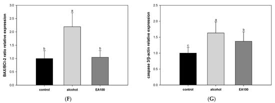 The results of investigating the ameliorating mechanism of EA against apoptosis in AFLD are shown in Figure 8. The expression levels of phospho-c-Jun N-terminal kinases (p-JNK) and BAX related to apoptosis, were significantly increased in the alcohol group (1.98 and 1.50, respectively) compared to the control group (Figure 8B,D). EA100 (1.41 and 0.80, respectively) significantly improved compared to the alcohol group. On the other hand, the expression levels of phospho-protein kinase B (p-Akt) and B-cell lymphoma 2 (BCl-2), factors related to anti-apoptosis, were significantly decreased in the alcohol group (0.64 and 0.63, respectively) compared to the control group, and EA100 (1.12 and 0.80, respectively) was significantly improved compared to the alcohol group (Figure 8C,E). As a result of measuring the BAX/BCl-2 ratio relative expression, the BAX/BCl-2 level in the alcohol group (2.19) was shown to be significantly increased compared to the control group. EA100 (1.05) was improved to the expression level similar to the control group (Figure 8F). In addition, the expression level of caspase 3 in the alcohol group (1.16) was significantly increased compared to the control group (Figure 8G). On the other hand, EA100 (1.37) significantly improved compared to the alcohol group.