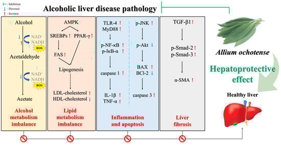 Excessive consumption of alcohol can be a cause of social, economic, and clinical complications worldwide, and alcoholic liver disease (ALD) is regarded as a leading cause of alcohol-related death [,]. Excessive drinking over a long period of time can cause damage to most organs of the body, and rapid deterioration of the liver, an essential part of ethanol metabolism, can be fatal []. Alcohol, which is rapidly absorbed from the gastrointestinal tract and metabolized by hepatocytes by alcohol dehydrogenase (ADH) into acetaldehyde, is a highly toxic compound []. It is then further metabolized into acetate by acetaldehyde dehydrogenase (ALDH), and with chronic consumption of alcohol, expression of cytochrome P4502E1 (CYP2E1) enzyme can show a notable increase, leading to the production of reactive oxygen species (ROS), oxidative stress, and inflammation []. Although the pathogenesis of ALD has not yet been clearly determined, it is believed to include lipid peroxidation, oxidative stress, production of ROS, and metabolic disorders of the liver in addition to the direct hepatotoxicity of ethanol []. In addition, acetaldehyde produced during the metabolism of ethanol can increase the ratio of reduced nicotinamide adenine dinucleotide (NADH) and oxidized nicotinamide adenine dinucleotide (NAD+), thereby reducing β-oxidation of fatty acids, thereby inducing fatty liver []. In particular, alcohol and/or acetaldehyde can inhibit the phosphorylation of AMP-activated protein kinase (AMPK) and increase the expression of sterol regulatory element-binding proteins-1 (SREBP-1), resulting in an imbalance in lipid metabolism, ultimately contributing to the development of hepatic steatosis [,]. Accumulation of lipids in hepatocytes can be classified as a characteristic of early ALD and may progress to alcoholic steatohepatitis characterized by liver cell damage and inflammation of liver cells or acute alcoholic hepatitis [,,]. Also, increased intestinal permeability due to excessive consumption of ethanol can increase the transport of Gram-negative bacterial-derived lipopolysaccharide (LPS) from the intestine to the liver []. It can induce activation of Kupffer cells through the LPS/toll-like receptor–4 (TLR-4) pathway, resulting in activation of nuclear factor kappa-light-chain-enhancer of activated B cells (NF-κB), with the production of pro-inflammatory cytokines including tumor necrosis factor-alpha (TNF-α) [,]. In addition, increased levels of pro-inflammatory cytokines can accelerate the formation of free radicals through a reduction of nicotinamide adenine dinucleotide phosphate (NADPH) oxidase and induction of CYP2E1 []. Production of ROS and oxidative stress caused by ethanol or acetaldehyde can increase the translocation of B-cell lymphoma 2 (BCl-2)-associated X protein (BAX) to the outer mitochondrial membrane []. Thus, mitochondrial membrane permeability and transition potential are reduced, and the release of cytochrome C can lead to the activation of factors associated with the endogenous apoptotic pathway such as caspase 9 and caspase 3 []. Liver damage can occur in ALD patients; acetaldehyde-protein adducts can cause damage to hepatocyte mitochondria but can also activate stellate cells along with inflammatory cells in liver sinusoids [,]. Activated stellate cells can induce fibrotic genes such as alpha-1 smooth muscle actin and collagen-1 and produce collagen. Sustained and long-term activation of hepatic stellate cells and myofibroblasts can ultimately lead to the development of liver fibrosis []. Cirrhosis, characterized by liver fibrosis, is irreversible. Therefore, early prevention of ALD when no irreversible injury has occurred is important [].
