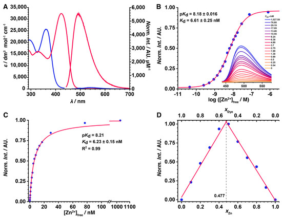 (A) UV-VIS and fluorescence spectra of the reported probe without Zn2+ (blue) and in the presence of 1 mM Zn2+ (red) in HEPES (pH 7.4). (B) Fluorimetric titration of GFZnP BIPY with Zn2+. The fluorescence intensity (blue dots) is plotted against the free Zn2+ concentration on a logarithmic scale (red line: fitted logistic curve) and (C) on a linear scale (red line: fitted 1:1 complex model, Equation (5)). (D) Fluorescence Job’s plot of GFZnP BIPY with Zn2+.