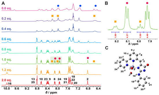 (A) 1H NMR spectra of solutions of GFZnP BIPY in DMSO-d6 containing different amounts of Zn2+. (B) Zoomed-in region showing well-resolved peaks of the two formed complexes at 1 equiv. with added Zn2+. (C) Optimized structure of GFZnP BIPY–Zn2+ complex (M06-2X/6-311++G(2d,2p)//PCM(water)). Gray and white colors mark carbon and hydrogen respectively, while red, blue and light blue mark oxygen, nitrogen and zinc atoms, respectively.