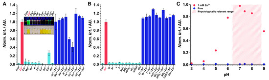 (A) The cation and (B) anion selectivity of GFZnP BIPY. Normalized fluorescence intensity of the probe in the presence of 1 mM of different interfering ions (turquoise), Zn2+ (red), or both of them simultaneously (blue); inset: photographs of vials containing the same solutions under UV light (above) and ambient light (below). Error bars represent the standard deviation of triplicate measurements. (C) Normalized fluorescence intensity of the probe in buffers at different pH levels in the presence of Zn2+ (1mM, red) or EGTA (zinc-free, blue). The pink background shows the physiologically relevant pH range.