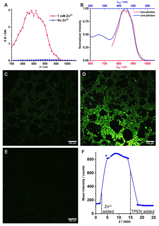 (A) Two-photon action cross section spectrum of GFZnP BIPY in the presence of Zn2+ ions (red) and without Zn2+ (blue). (B) Comparison of the one-photon and two-photon absorption spectra of GFZnP BIPY in the presence of Zn2+. (C) Two-photon image of HEK 293 cells stained with GFZnP BIPY (D) after the addition of Zn2+ and (E) after the withdrawal of Zn2+. (F) Mean two-photon fluorescence intensity of whole images containing the shown cell samples plotted against the time from the start of the experiment. GM: Goeppert Mayer unit.