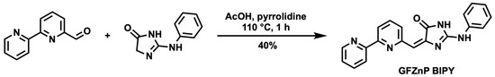 The synthesis of GFZnP BIPY was carried out based on [2,2′-bipyridine]-4-carbaldehyde and the respective imidazolinones (Scheme 1), which can be synthesized in a single step, as reported before [33]. After dissolving the two compounds in acetic acid, a catalytic amount of pyrrolidine was added, and the mixture was stirred at 110 °C for 1 h. After cooling to 5 °C, the product was precipitated from the reaction mixture, and the pure compound was isolated by simple filtration (>98%, HPLC). In the case of GFZnP BIPY, no further purification was needed, as opposed to the similar probes previously reported in the literature, which needed multiple synthetic steps and solvents and time-consuming purification with preparative HPLC.