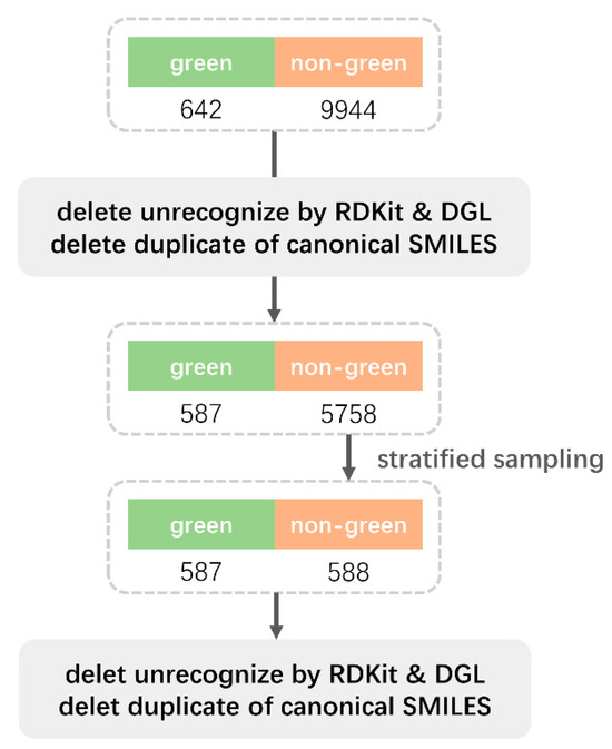 The data for the article was downloaded from the LRI & Odour Database—Odour Data, Flavornet and The Good Scents Company Information System, as well as the paper by Hatanaka et al. [2,21]. We extracted 9944 non-green odor molecules and 642 green odor molecules from the database, as indicated in Figure 1. After deleting molecules that RDKit and DGL were unable to identify, as well as duplicates, the data was cleaned, yielding 5758 non-green odor molecules and 587 green odor molecules. In order to achieve a 1:1 ratio of green odor molecules to non-green odor molecules, the 5758 non-green odor molecules were stratified and up-sampled to 588 molecules. A link is provided to the source code of the organized and balanced data: mlp4green/data_clean.py at main—heyigacu/mlp4green—GitHub. Ten repetitions and five cross-validations were performed on the final green/non-green dataset.