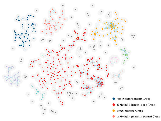 Cluster analysis of 587 green odor molecules. The light gray circles represent the threshold radii of the molecules, and molecules with two intersecting radii are divided into groups; Groups with less than 7 molecules are shown in gray, and groups with more than 7 molecules are shown in color. Groups of different molecules are shown in different colors.