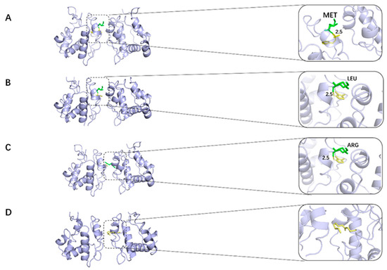 Results of the molecular docking analysis of four typical molecules for the insect odor-binding protein (OBP). (A): 2_Methyl_4_phenyl_2_butanol docked to the active residues around OBP. (B): Dimethylthiazolel docked to the active residues around OBP. (C): 6-Methyl-3-hepten-2-one docked to the active residues surrounding OBP. (D): Hexyl valerate docked to the active residues around OBP. (The yellow portion is the small molecule used for docking and the green portion is the amino acid residue where the small molecule creates an interaction).
