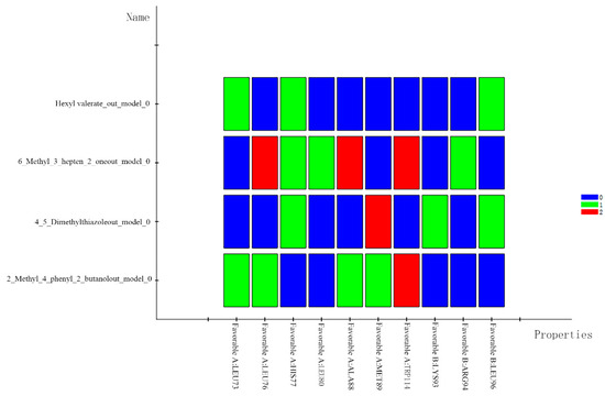 As above, the molecular docking thermograms were analyzed as shown in Figure 4. For the 6-methyl-3-hepten-2-one subgroup, LEU76, ALA88, and TRP114 generated the highest number of hydrogen bonds with the odorant small molecules, which are the key residues in the docking process. The 4,5-Dimethylthiazolel group and 2_Methyl_4_phenyl_2 group depend on MET89 and TRP114. The interaction between the 4,5-Dimethylthiazolel group and the 2_Methyl_4_phenyl_2_butanol group, respectively, is significantly influenced by MET89 and TRP114.