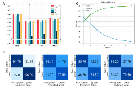 (A): Performance of the 4 models on 6 performance metrics. (B): Four models’ confusion matrix (MLP, RF, SVM, MPNN). The genuine label of the molecule is represented by the vertical coordinate of the graph, while the anticipated label is represented by the horizontal coordinate. (C): Performance of data training in the model. The color shade indicates how high or low the predicted value is for that region.