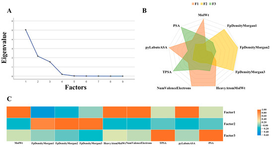 Factor analysis of green and non-green datasets. (A): Scree plot of factor eigenvalues. (B): Radar plot of the three factors comprising the filtered descriptors. (C): Heat map of factor loading matrix.