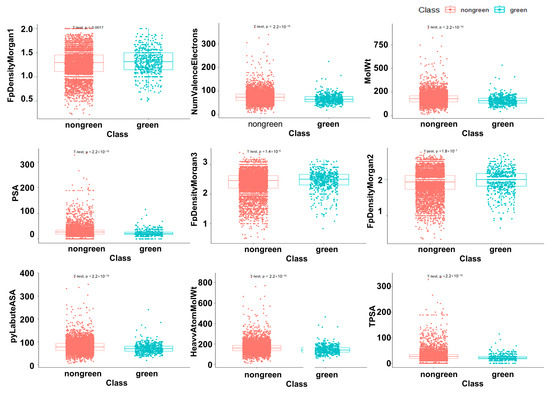 A total of 208 characteristics of green and non-green odor molecules were factor examined. The high eigenvalues of Factor 1, Factor 2, and Factor 3 are evident in Figure 7. These three elements were our choice for common factors. The factor loadings for Factor 1, Factor 2, and Factor 3 on the nine descriptors (Table 2) are displayed in Figure 7B. Table 2 displays the association between these three common parameters and the nine descriptors; Figure 7C shows that the greater the correlation and the deeper the hue, the larger the value. We examined how the nine characteristics of green and non-green odor molecules differed from one another (Figure 8) when the significance level is below 0.05. The nine metrics are FpDensityMorgan1, FpDensityMorgan2, FpDensityMorgan3, NumValenceElectrons, MolWt, PSA, pyLabuteASA, HeavyAtomMolWt, and TPSA.