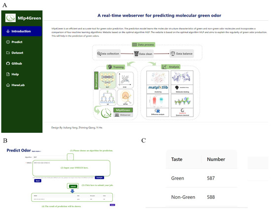 Based on the selected MLP model, we built a website named Mlp4green with the URL (https://hwwlab.com/webserver/mlp4green, accessed on 20 December 2023). The smiles formula of the molecule is entered on the prediction homepage of the website and submitted to obtain the probability of whether the molecule contains a green odor or not (Figure 9).