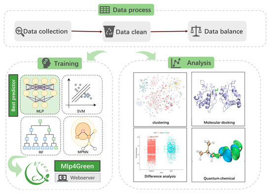 In Figure 10, our workflow is displayed. To obtain the training dataset, we extracted the green and non-green odors from the database molecules, cleaned them, and balanced them. Four models (SVM, MLP, RF, and MPNN) were trained on the processed dataset, and the top model was chosen to be implemented on the website. In parallel, molecule docking, quantum chemistry calculations, factor analysis, clustering, and difference analysis were carried out.