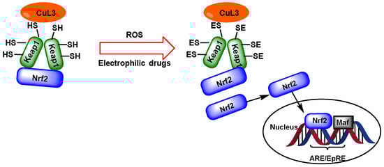 When cells are exposed to ROS and electrophiles, the thiol groups of cysteine residues in Keap1 are directly modified, leading to a decrease in Keap1-dependent NRF2 ubiquitination and a rapid accumulation of newly synthesized NRF2. Subsequently, NRF2 is stabilized, translocates to the nucleus and forms a heterodimer with small Maf proteins, and activates target genes for cytoprotection through antioxidant response elements (AREs) or electrophile responsive elements (EpREs).