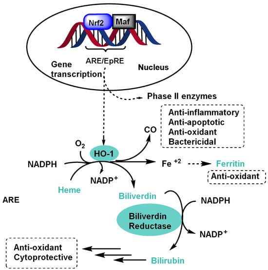 HO-1 enzyme activity. HO-1 enzyme activity generates carbon monoxide (CO), free iron (Fe2+), and biliverdin IXa in equimolar amounts. Biliverdin is rapidly metabolized to bilirubin by biliverdin reductase. Free iron, which can stimulate free radical formation, is rapidly scavenged by ferritin (an antioxidant). At physiological concentrations, CO has cytoprotective, anti-inflammatory, antioxidant, and bactericidal properties [26,27].
