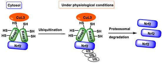 Under normal conditions, NRF2 is ubiquitinated by Keap1 and its degradation is carried out by proteasomes.