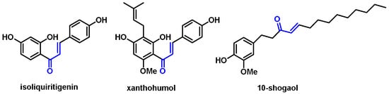 Molecular structure of xanthohumol, isoliquiritigenin, and 10-shogaol.