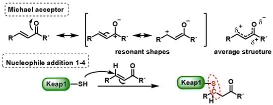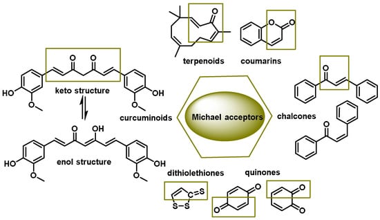 Dithiolethiones, curcuminoids, chalcones, quinones, terpenoids, and coumarins are all types of Michael acceptors. Michael acceptors are compounds with double bonds that are near electron-withdrawing groups. The preferred electronic groups include carbonyl, nitrile, and nitro groups [102]. A molecule with an α,β-unsaturated carbonyl group is referred to as a Michael acceptor [103] (Figure 6).