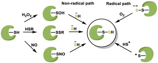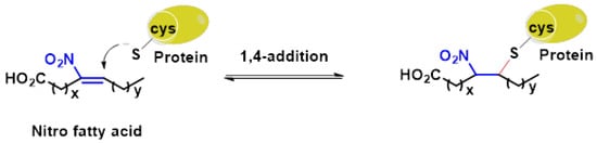 Michael acceptors can undergo an addition reaction with the thiol group of cysteines. The sulfur of the cysteine residue reacts with an activated carbon in the Michael acceptor molecule [104]. The sulfur of the cysteine molecule reacts in a nucleophilic 1–4 addition with the carbon of the Michael acceptor chemical. This reaction, which is part of a broader category of conjugate additions, can efficiently form S–C bonds under mild conditions (Figure 7).