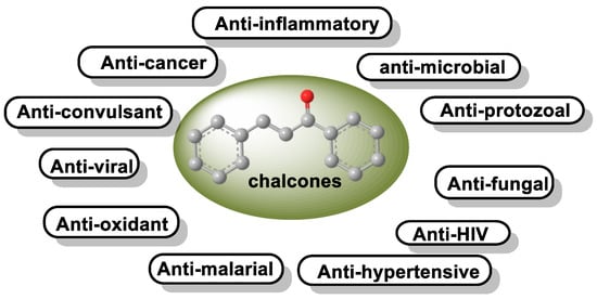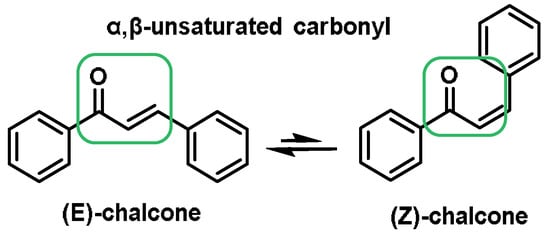 - Chalcones are aromatic ketones that serve as building blocks for several important biological compounds known as bioactive substances. They are present in a variety of foods, such as vegetables, fruits, and teas, as well as in fluorescent materials and chemical intermediates [109]. Chalcones can occur in two forms (cis and trans isomers). Chalcones have a simple chemical compound structure. The trans isomer is thermodynamically more stable. The presence of the Michael acceptor, an α,β-unsaturated carbonyl system, is a key factor in the observed biological activity. They can easily obtain the Michael adduct due to the facile formation of covalent bonds with nucleophiles such as the sulfhydryl group of cysteine residues [110]. Chalcones are predominantly soft electrophiles and soft nucleophiles that have an affinity for thiol moieties. Chalcones are used in medicinal chemistry for many purposes, e.g., as antioxidants, anticancer drugs, antidiabetics, antiviral agents, and antimalarials [111];