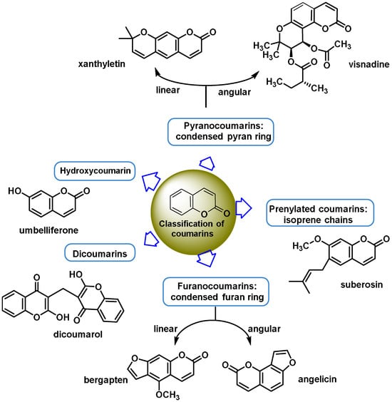 - Coumarins are phenolic compounds derived from cinnamic acid and are present in several plant species, including edible, medicinal, and aromatic plants from different botanical families, as well as in fungi and bacteria. Coumarins belong to the class of benzopyrans and are present in a variety of medicinal plants [113,114,115,116]. They exhibit a broad spectrum of pharmacological effects, such as anti-inflammatory, anticoagulant, anticancer, antibacterial, antimalarial, antifungal, antiviral, ulcerogenic, and antihypertensive effects. They are present in various parts of plants, such as roots, seeds, nuts, flowers, and fruits, either as heterosides or in their free form. Coumarins are classified as Michael acceptors as they contain an α,β-unsaturated carbonyl [117];