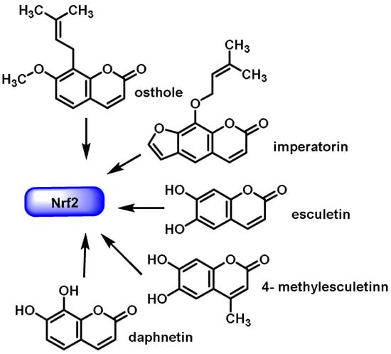 - Di Stasi, L.C. Natural Coumarin Derivatives Activating Nrf2 Signaling Pathway as Lead Compounds for the Design and Synthesis of Intestinal Anti-Inflammatory Drugs. Pharmaceuticals 2023, 16, 511. [Google Scholar] [CrossRef] [PubMed]