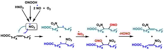 - Freeman, B.A.; Baker, P.R.; Schopfer, F.J.; Woodcock, S.R.; Napolitano, A.; d’Ischia, M. Nitro-fatty acid formation and signaling. J. Biol. Chem. 2008, 283, 15515–15519. [Google Scholar] [CrossRef] [PubMed]
