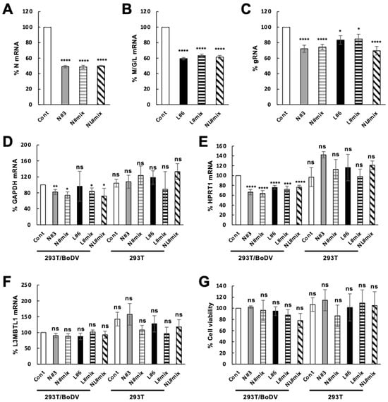 - Teng, D.; Obika, S.; Ueda, K.; Honda, T. A Small Interfering RNA Cocktail Targeting the Nucleoprotein and Large Protein Genes Suppresses Borna Disease Virus Infection. Front. Microbiol. 2019, 10, 2781. [Google Scholar] [CrossRef] [PubMed]