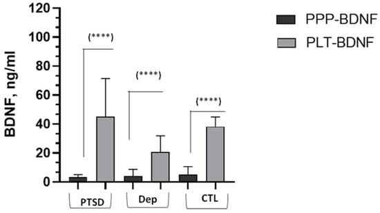 Comparison of PPP-BDNF vs. PLT-BDNF levels (ng/mL) within each group. Bar histograms represent the BDNF mean and SD of n = 20 BD patients with PTSD (PTSD), n = 20 BD patients in a major depression episode (DEP) and n = 24 healthy controls (CTL). (****): Wilcoxon test, p < 0.0001, significantly higher amounts of PLT-BDNF than PPP-BDNF.
