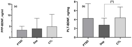 Comparison of (a) PPP- and (b) PLT-BDNF levels among groups. The bar histograms represent the mean and SD of BDNF levels measured in BD patients with PTSD (n = 20, PTDS), in BD patients in a major depressive episode (n = 20, DEP) and in healthy controls (n = 24, CTL). (b) (*): significant Kruskal–Wallis analysis, p < 0.05.