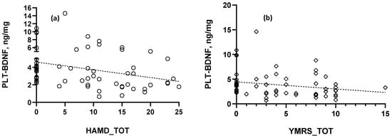 No significant Spearman correlation occurred between PPP-BDNF and PLT-BDNF levels, whereas PLT-BDNF concentrations were found negatively correlated with both the HAM-D and the YMRS total scores: (a) RS = −0.369, (**) p < 0.01; (b) RS = −0.31, (*) p < 0.05, respectively (Figure 3). Conversely, no significant correlation was reported for PPP-BDNF related with HAM-D depression scores, displaying a p value near the statistical significance level (RS = −0.21, p = 0.09).
