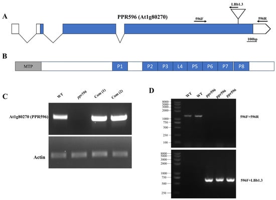 DNA was extracted from green leaves using the Edwards DNA extraction method [59]. The T-DNA insertion position in the ppr596 mutant (SAIL_367_A06) and heterozygous mutants was confirmed by PCR using the primer sets listed in Table S1.