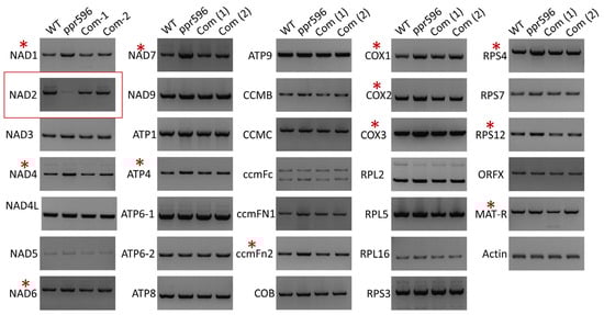 Analysis of mitochondrial gene transcripts in the ppr596 mutant. RT-PCR analysis of 33 mitochondrial protein-coding genes in the ppr596 mutant with WT and complemented plants. Actin expression was used as the loading control. Transcripts of nad2 (highlighted in red box) were severely decreased in the ppr596 mutant. The expression of some genes increased in the ppr596 mutant, as indicated by the asterisk.