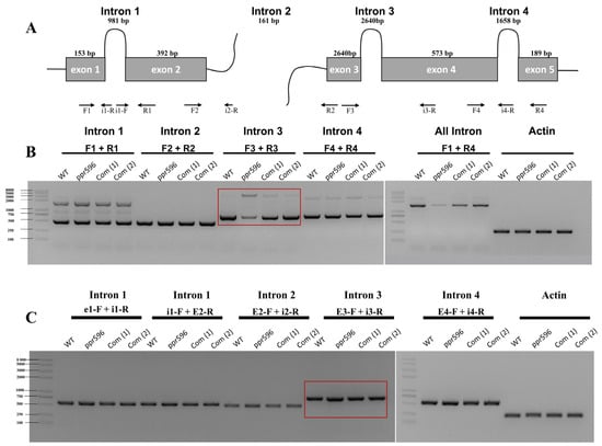 PPR proteins are RNA-binding proteins involved in RNA metabolism including RNA maturation, splicing, and C-to-U RNA editing in mitochondria and chloroplasts. PPR596 is a P-type PPR protein that has previously been reported to partially decrease the editing of mitochondrial ribosomal protein S3 (RPS3) transcripts [29]. PPR596, POCO1 [33] and PPME [34], have been frequently cited as exceptional P-type PPR proteins for their role in RNA-editing [16,35,36,37]. However, most P-type PPR proteins are primarily associated with RNA stabilization and splicing in organelles. To further investigate the possible functions of PPR596, all mature transcripts of mitochondrial protein-coding genes were examined by semi-quantitative RT-PCR in the ppr596 mutant, WT, and complementation lines using the primers listed in Table S1. Notably, we observed a significant reduction in the abundance of mature nad2 transcripts in the ppr596 mutant compared with the WT and complementation lines (Figure 3). Additionally, the expression levels of various mitochondrial transcripts, including nad1, nad4, nad6, nad7, atp4, ccmFn2, cox1, cox2, cox3, Rps4, rps12, and MAT-R, were higher in the ppr596 mutant than in WT and complemented plants.