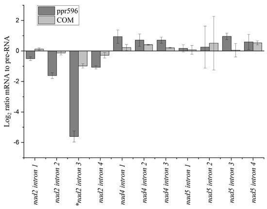 Confirmation of nad2 intron 3 splicing efficiency through quantitative RT-PCR. The nad4 and nad5 introns’ splicing was used as control. The relative accumulation of mRNA and pre-RNA transcripts was analyzed in both WT and ppr596 mutant plants. The histogram shows the splicing efficiencies, as indicated by log2 ratios of pre-RNA to mature RNA abundance in the ppr596 mutant compared to the WT plants. Asterisks indicate altered splicing of nad2 intron 3.