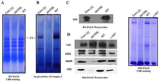 nad2 encodes a subunit of the mitochondrial complex I (CI) in the electron transfer chain. Nad2 is the core CI subunit located in the matrix arm [38]. To investigate the effect of defective splicing on the assembly of complex I, we analyzed the mitochondrial complex profile by blue native polyacrylamide gel electrophoresis (BN-PAGE), in-gel activity assay, and immunoblotting. Mitochondria were isolated from ppr596, WT, and complementation line seedlings grown in the dark as described [39]. Mitochondrial membrane complexes were solubilized with n-dodecyl-β-D-maltoside (β-DM), separated by BN-PAGE, and subjected to in-gel complex activity assay [40] and immunoblotting assays. Coomassie Brilliant Blue (CBB) staining of the gels revealed a significant reduction in CI in the ppr596 mutant compared to WT and complemented plants (Figure 6A). The in-gel activity of CI indicated that the CI activity was severely reduced in ppr596 and partially restored in the complementation line (Figure 6B). The reduction in CI assembly was further confirmed by immunoblotting using antibodies against the CI carbonic anhydrase-like subunit 2 (CA2), one of the first subunits to be incorporated in CI (Figure 6C) [41]. These results strongly support the crucial role of PPR596 in the assembly of CI.