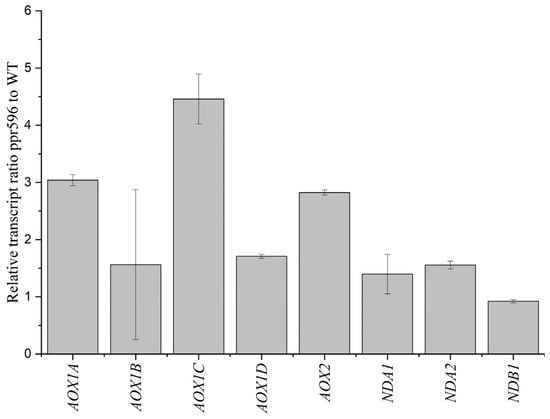 It has been reported that the dysfunction of mitochondrial CI activates the alternative respiratory pathway as an adaptive response to mitochondrial stress [42,43,44]. To further assess the induction of alternative respiratory pathways, we measured the expression levels of various alternative oxidase (AOX) genes and rotenone-insensitive NAD(P)H dehydrogenase (NDs) in mutant plants. qRT-PCR analysis indicated that the relative accumulation of these genes transcripts was higher in mutant plants than in WT plants (Figure 7).