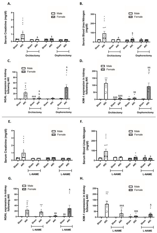 The impact of AKI on kidney function/renal injury in αMUPA male and female mice before and after Gonadectomy/L-NAME treatment. (A) Serum creatinine level; (B) Blood urea nitrogen (BUN) level; (C) Renal expression of NGAL and (D) Renal expression of KIM-1 following Orchiectomy (males) or Oophorectomy (females); (E) Serum creatinine level; (F) Blood urea nitrogen (BUN) level; (G) Renal expression of NGAL and (H) Renal expression of KIM-1; following L-NAME treatment. * p < 0.05, ** p < 0.01, *** p < 0.001—Sham vs. AKI in the same group, $ p < 0.05, $$ p < 0.01, $$$ p < 0.001—male vs. female, which underwent similar procedure/treatment, & p < 0.05, && p < 0.01, &&& p < 0.001—before vs. after Orchiectomy (males) or Oophorectomy (females)/L-NAME treatment.