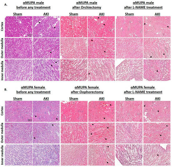 Effects of AKI on renal histology of αMUPA male and female mice before and after gonadectomy/L-NAME treatment. (A) Representative cortical, outer medullary and inner medullary histological sections of kidneys stained with hematoxylin and eosin taken from αMUPA male mice: 1—untreated male sham αMUPA mice (first column), 2—untreated male AKI αMUPA mice (second column); 3—male sham αMUPA mice that underwent orchiectomy (third column), 4—male AKI αMUPA mice that underwent orchiectomy (fourth column); 5—male sham αMUPA mice after L-NAME treatment (fifth column), 6—male AKI αMUPA mice after L-NAME treatment (sixth column). (B) Renal sections taken from kidneys of αMUPA female mice. The long arrows indicate tubular collapse, loss of the brush border, cellular detachment from tubular basement membranes, the short arrows indicate congestion. Images were taken in X20 magnification, scale bar = 100 µm.