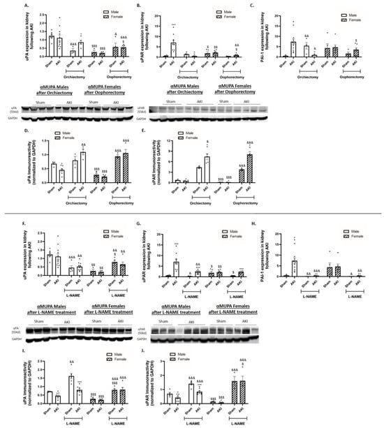 The impact of AKI on renal expression and abundance of uPA and uPAR in αMUPA male and female mice before and after gonadectomy/L-NAME treatment. (A) Urokinase plasminogen activator (uPA) expression; (B) urokinase plasminogen receptor (uPAR) expression; (C) plasminogen activator inhibitor 1 (PAI-1) expression; (D) immunoreactive levels of urokinase plasminogen activator (uPA); and (E) immunoreactive levels of urokinase plasminogen activator receptor (uPAR) following orchiectomy (males) or oophorectomy (females). (F) Urokinase plasminogen activator (uPA) expression; (G) urokinase plasminogen receptor (uPAR) expression; (H) plasminogen activator inhibitor 1 (PAI-1) expression; (I) immunoreactive levels of urokinase plasminogen activator (uPA); and (J) immunoreactive levels of urokinase plasminogen activator receptor (uPAR) after L-NAME treatment. (* p < 0.05, ** p < 0.01, *** p < 0.001—sham vs. AKI in the same group, $ p < 0.05, $$ p < 0.01, $$$ p < 0.001—male vs. female, which underwent similar procedure/treatment, & p < 0.05, && p < 0.01, &&& p < 0.001—before vs. after orchiectomy (males) or oophorectomy (females)/L-NAME treatment).