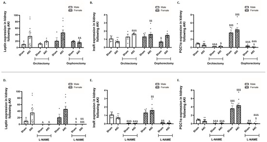 The impact of AKI on the expression of renal leptin, insulin receptor and PGC1-α in αMUPA male and female mice before and after gonadectomy/L-NAME treatment. (A) Leptin; (B) insulin receptor (InsR); and (C) PGC1α following orchiectomy (males) or oophorectomy (females). (D) Leptin; (E) insulin receptor (InsR); and (F) PGC1α following L-NAME treatment. (* p < 0.05, ** p < 0.01—sham vs. AKI in the same group, $ p < 0.05, $$ p < 0.01, $$$ p < 0.001—male vs. female, which underwent similar procedure/treatment, & p < 0.05, && p < 0.01, &&& p < 0.001—before vs. after orchiectomy (males) or oophorectomy (females)/L-NAME treatment).