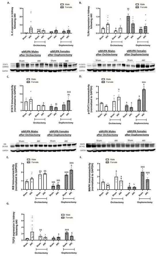 The impact of AKI on renal expression/abundance of inflammatory and fibrotic markers in αMUPA male and female mice before and after gonadectomy/L-NAME treatment. (A) Expression of IL-6; (B) expression of Toll like receptor 4 (TLR4); (C) immunoreactive levels of STAT3; (D) immunoreactive levels of p-STAT3; (E) immunoreactive levels of IKB; (F) immunoreactive levels of MAPK; and (G) expression of TGFβ following orchiectomy (males) or oophorectomy (females). (H) Expression of IL-6; (I) expression of Toll like receptor 4 (TLR4); (J) immunoreactive levels of STAT3; (K) immunoreactive levels of p-STAT3; (L) immunoreactive levels of IKB; (M) immunoreactive levels of MAPK; and (N) expression of TGFβ after L-NAME treatment. (* p < 0.05, ** p < 0.01, —sham vs. AKI in the same group, $ p < 0.05, $$ p < 0.01, $$$ p < 0.001—male vs. female, which underwent similar procedure/treatment, & p < 0.05, && p < 0.01, &&& p < 0.001—before vs. after orchiectomy (males) or oophorectomy (females)/L-NAME treatment).