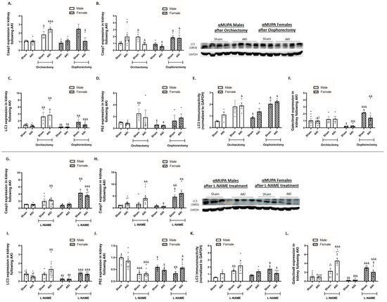 Impact of AKI on renal expression/abundance of apoptotic and autophagy markers in αMUPA male and female mice before and after gonadectomy/L-NAME treatment. (A) Expression of Caspase 3; (B) expression of Caspase 7; (C) expression of LC3; (D) expression of P62; (E) immunoreactive levels of LC3; and (F) expression of Galectin 8 following orchiectomy (males) or oophorectomy (females). (G) Expression of Caspase 3; (H) expression of Caspase 7; (I) expression of LC3; (J) expression of P62; (K) immunoreactive levels of LC3; and (L) expression of Galectin 8 after L-NAME treatment. (* p < 0.05—sham vs. AKI in the same group, $ p < 0.05, $$ p < 0.01, $$$ p < 0.001—male vs. female, which underwent similar procedure/treatment, & p < 0.05, && p < 0.01, &&& p < 0.001—before vs. after orchiectomy (males) or oophorectomy (females)/L-NAME treatment).
