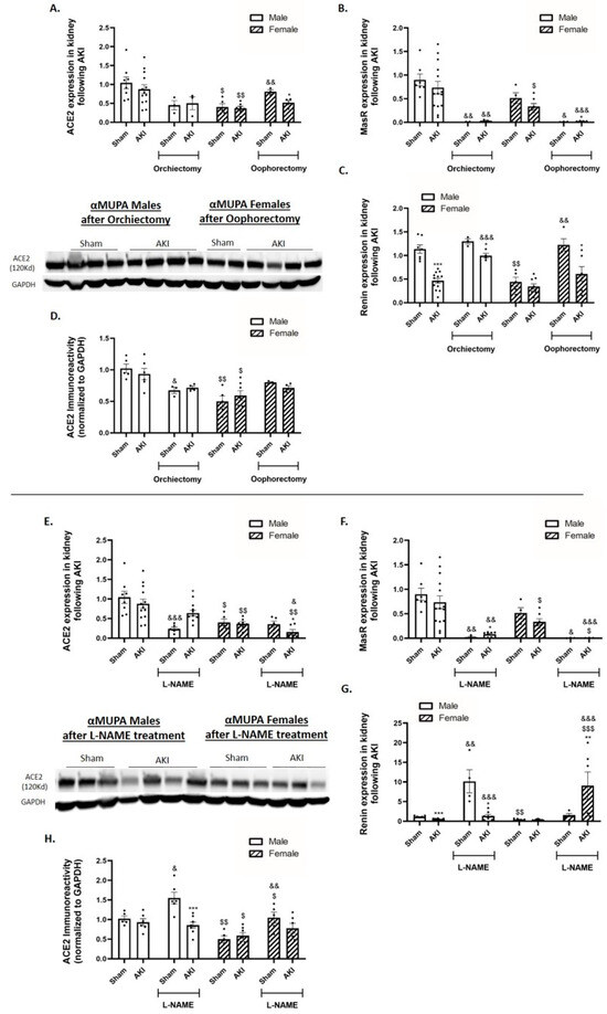 Effect of AKI on renal ACE2, MasR and renin in αMUPA male and female mice before and after gonadectomy/L-NAME treatment. (A) Expression of ACE2; (B) expression of Mas receptor; (C) expression of renin; and (D) ACE2 immunoreactive levels amount following orchiectomy (males) or oophorectomy (females). (E) Expression of ACE2; (F) expression of Mas receptor; (G) expression of renin; and (H) ACE2 immunoreactive levels amount after L-NAME treatment. (* p < 0.05, ** p < 0.01, *** p < 0.001—sham vs. AKI in the same group, $ p < 0.05, $$ p < 0.01, $$$ p < 0.001—male vs. female, which underwent similar procedure/treatment, & p < 0.05, && p < 0.01, &&& p < 0.001—before vs. after orchiectomy (males) or oophorectomy (females)/L-NAME treatment).