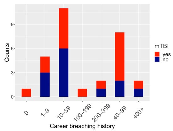Number of self-reported career breaching experiences at baseline prior to start of training exercises including 30 participants with/out history of mTBI (denoted in red and blue, respectively).