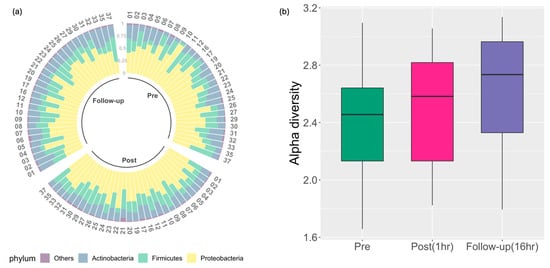 (a) Distribution of relative abundances of microbiota at phylum level at three time points, i.e., pre-blast, post-blast, and follow-up. Phylogenetic classification was performed to assign filtered candidate microbial reads to the microbial genes from 33 distinct taxa on the phylum level. Top three phyla, which include Proteobacteria, Firmicutes, and Actinobacteria, are shown in different colors depicting their proportions of RNA-seq reads mapped. From the vertex arranged clockwise are samples from 30 participants corresponding to pre-, post-training, and follow-up (1 h and 16 h post blast, respectively). Each participant is assigned a sequential ID number starting with ID number from 01 to 37. All “other” low abundant bacteria are grouped together. (b) Boxplot shows distribution of alpha diversity at phylum-level at each timepoint using time series blood RNA-seq data, i.e., pre-post and follow-up blast timepoints (i.e., 1 h and 16 h post blast, respectively). Significant (p = 0.049) stepwise increase in alpha diversity is observed following exposure to blast. Alpha diversity is derived using the inverse Simpson index, which simultaneously assesses both richness (corresponding to the number of distinct taxa) and relative abundance of the microbial communities within each sample.