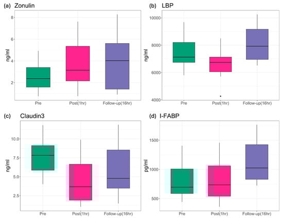 Levels of IP biomarkers in blood measured at each timepoint. Data are shown for (a) Zonulin, (b) LBP, (c) Claudin-3, and (d) I-FABP, respectively.