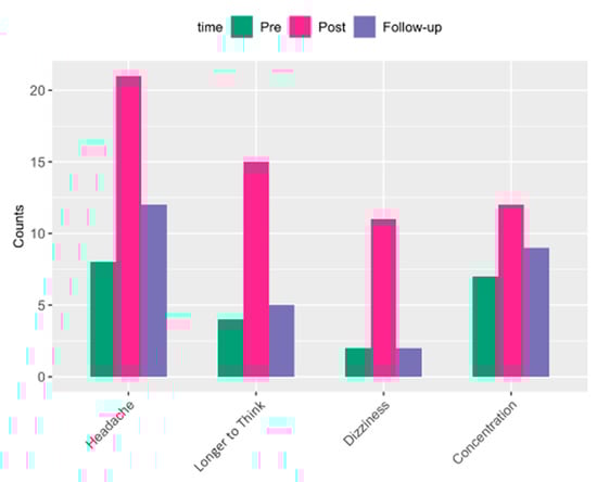 Symptom response frequencies from self-report surveys at each time point throughout the training (pre-blast, post-blast, and follow-up), showing elevated symptoms related to headache, slowed thinking, concentration, and dizziness, directly following exposure to blast (shown in pink bars).
